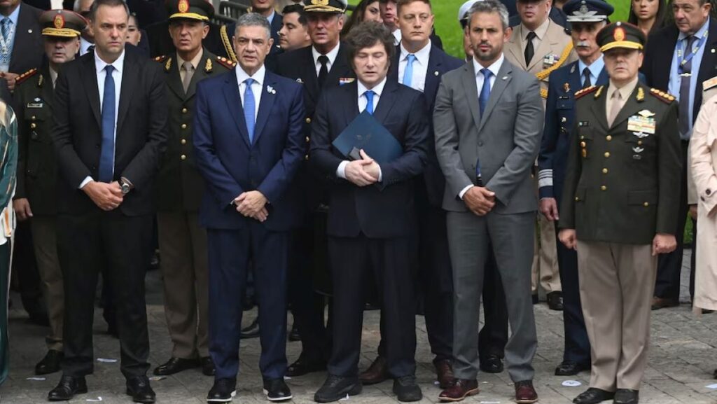 En el acto estuvieron presentes el jefe de Gabinete de la Ciudad de Buenos Aires, Jorge Macri, la secretaria general de la Presidencia, Karina Milei; y el jefe de Gabinete, Manuel Adorni, con quien el martes el jefe de Estado mantuvo una reunión en la quinta de Olivos, en medio de los escándalos por inconsistencias en su patrimonio y múltiples denuncias en la Justicia.