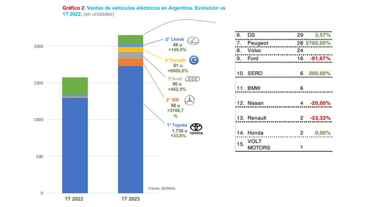 Un informe elaborado por SIOMMA (inteligencia del mercado automotor), releva el crecimiento que se generó en el año 2022 del mercado de vehículos eléctricos en Argentina, el cual en el primer trimestre de 2023 ya muestra algunos números que sin lugar a dudas superarán la suba de las ventas del año anterior.