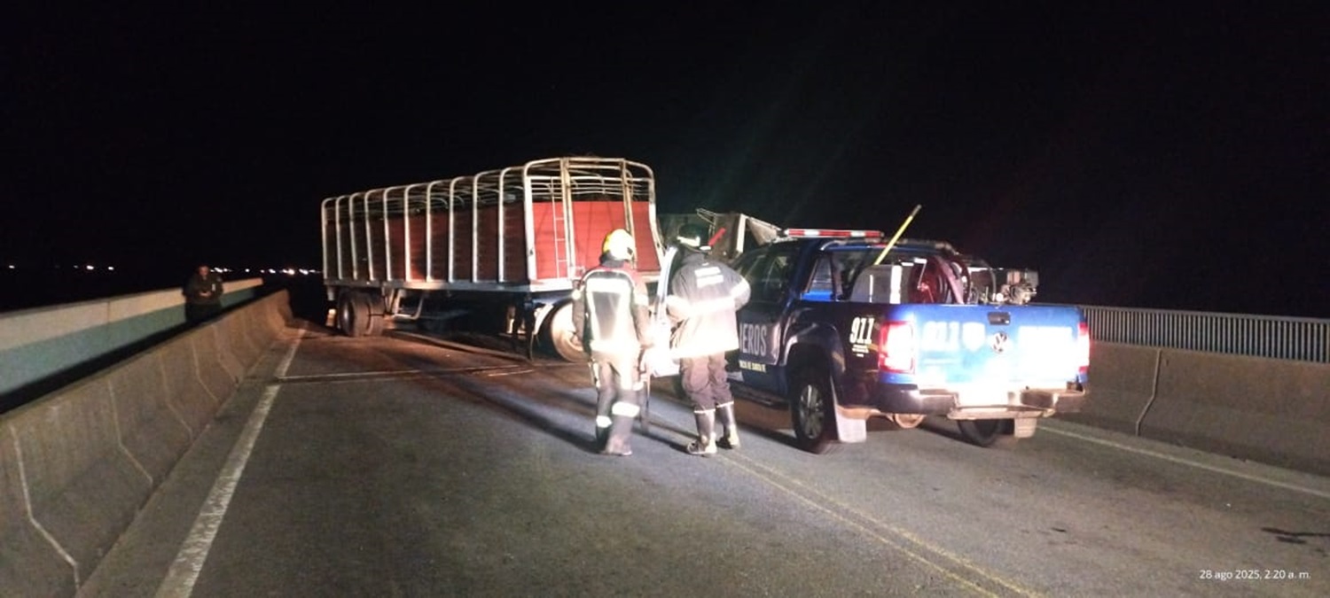 Durante la madrugada del jueves, sobre la ruta nacional 174 a la altura del peaje del Puente Rosario–Victoria (kilómetro 7), se produjo un fuerte accidente entre un camión que transportaba ganado y un utilitario que circulaba en dirección opuesta. El impacto obligó a interrumpir el paso vehicular mientras se realizaban las primeras maniobras de atención.