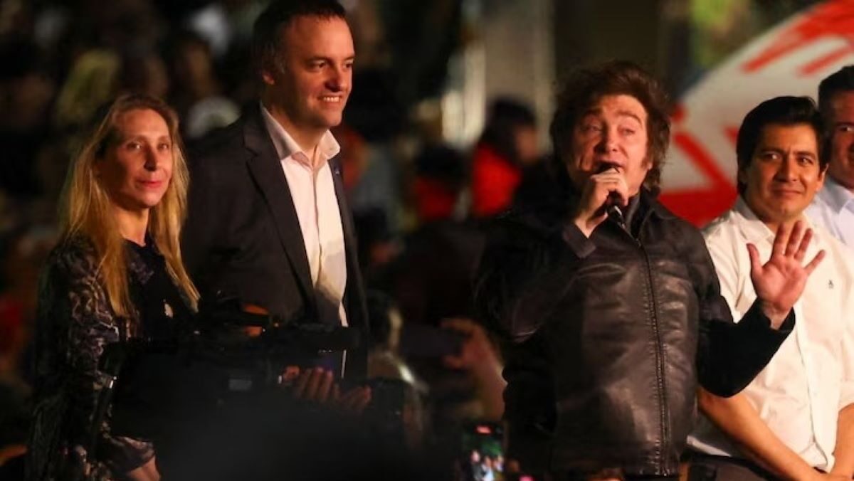 El mandatario estuvo acompañado en el escenario por el vocero presidencial, Manuel Adorni; su hermana, la secretaria general de Presidencia, Karina Milei; el presidente de la Cámara de Diputados, Martín Menem; y el candidato a diputado nacional por Córdoba, Gonzalo Roca.