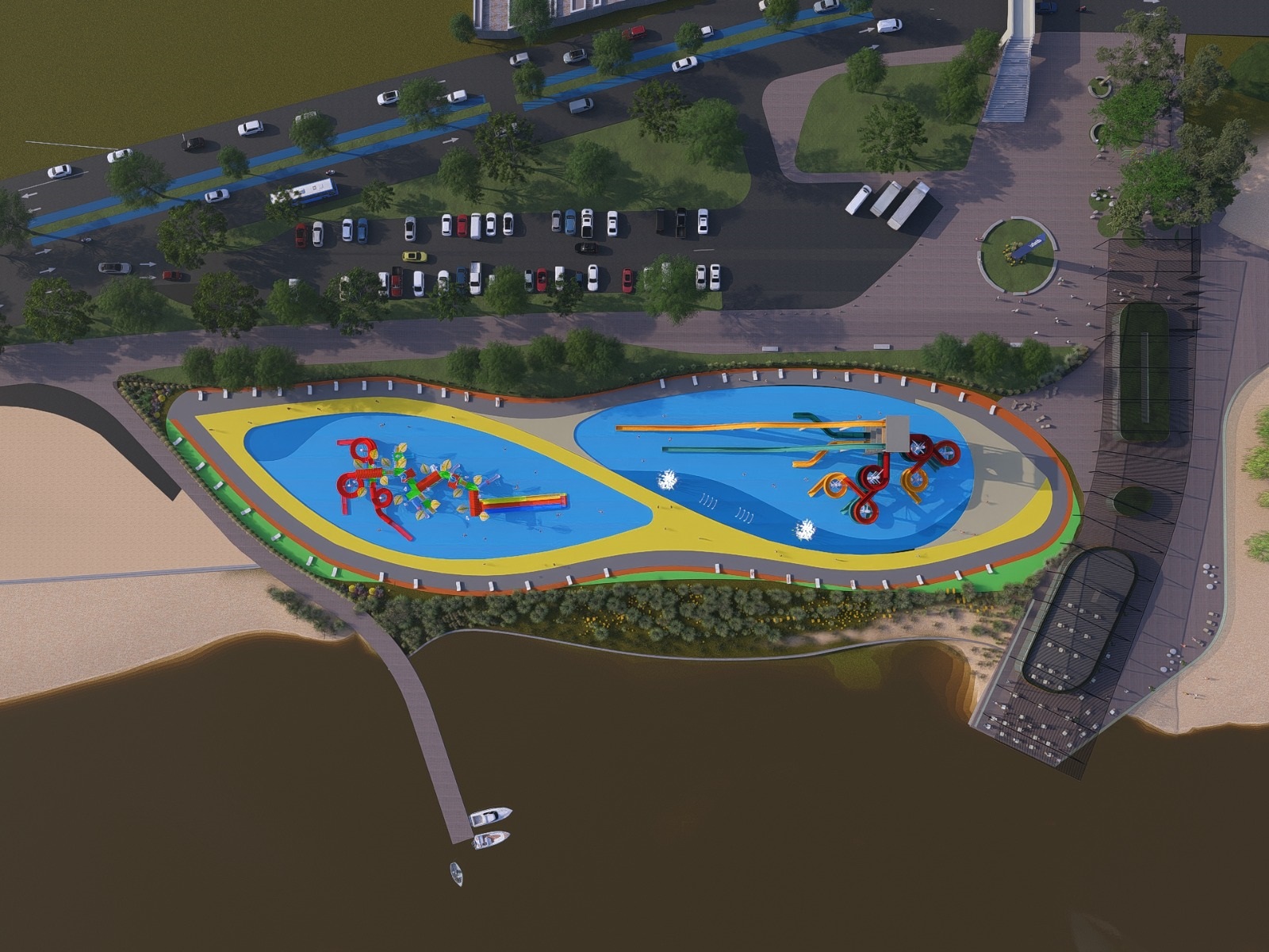 Por un lado, el sector infantil, ubicado al norte, contará con juegos de baja profundidad, toboganes de menor escala y dispositivos de aspersión, pensados para el público más pequeño. En el extremo sur, en tanto, se emplazará la torre de toboganes, una estructura de gran altura que concentrará diferentes propuestas de deslizamiento —abiertas, cerradas y de caída rápida—, optimizando el uso del espacio vertical.