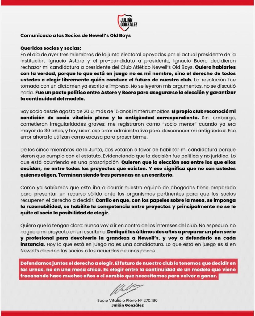 En ese sentido, González refutó: “Soy socio desde agosto de 2010, más de 15 años ininterrumpidos. El propio club reconoció mi propia condición de socio vitalicio pleno y la antigüedad correspondiente”.