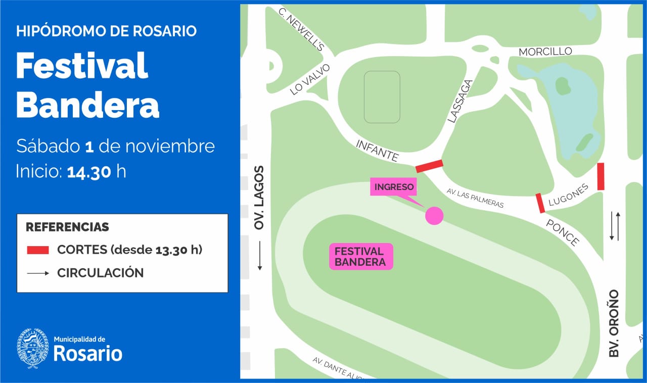 Mientras que en torno del Festival Bandera los cortes serán desde las 13.30 hs en el interior del Parque Independencia, en la zona del Hipódromo, lugar en el que se llevará a cabo el encuentro. Se realizarán en: