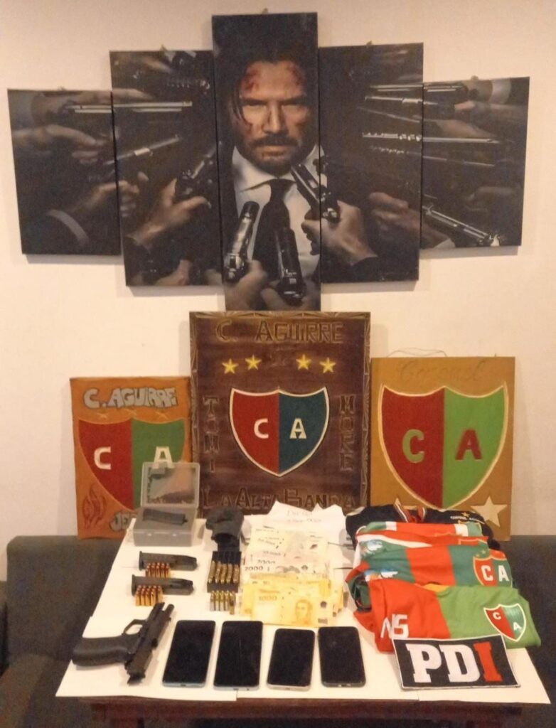 En los operativos en las viviendas, se secuetró una pistola Bersa calibre 9mm y una pistola doble cañón calibre 32; además de 69 municiones; 1.231.500 pesos en efectivo; 21 teléfonos celulares; dos pendrives; dos tarjetas SD; tres plantas de marihuana; dos motos Yamaha XTZ 250 y Motomel 110cc); un contrato de locación; y material de propaganda relacionado con la barrabrava de Coronel Aguirre.