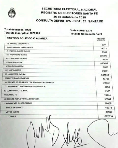 Los resultados oficiales confirmaron que La Libertad Avanza se quedó con cuatro escaños, seguida por Fuerza Patria con tres, y Provincias Unidas con dos. En total, se registraron 1.807.816 votos emitidos, de los cuales 86.918 fueron nulos y 40.370 en blanco. El alto número de votos anulados llamó la atención de la Justicia Electoral, que anticipó una revisión en mesas con irregularidades antes de la destrucción final de las urnas.