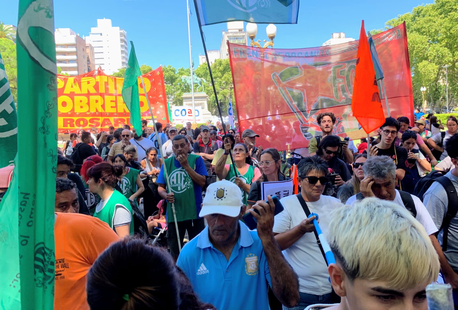 La concentración comenzó alrededor de las 11 en Plaza San Martín y formó parte de una jornada de protesta convocada a nivel nacional, con epicentro frente al Congreso. En Rosario, distintos gremios confirmaron además medidas de fuerza, entre ellos ATE, la CTA Autónoma, el Sindicato de Aceiteros y COAD, que representa a docentes e investigadores universitarios.