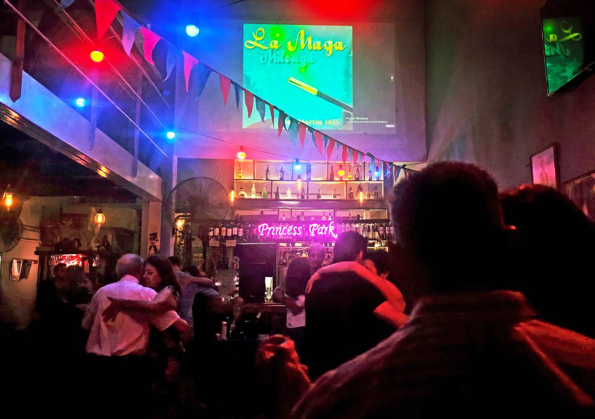 Los domingos el lugar se convierte en La Maga, una milonga tradicional donde la pista de baile toma protagonismo y se enciende cada vez que irrumpe el tango. Las parejas se amontonan, aprietan el abrazo y danzan por el salón en armonía. El movimiento se detiene en las pausas musicales y es ahí cuando el contraste desafía al tiempo.