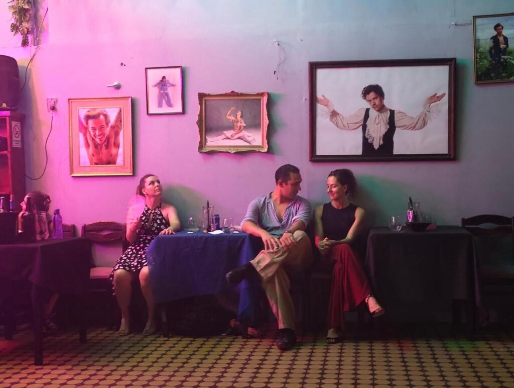 Desde la pared, Harry Styles con tutú de bailarina clásica o a punto de morder una banana interpela a milongueros de todas las edades que contemplan la escena desorientados.Se puede desconocer a una estrella contemporánea del pop británico.