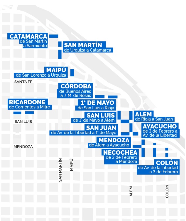 Una particularidad es que en el tramo de la cortada Ricardone, entre calles Corrientes y Mitre, está contemplado habilitar el estacionamiento paralelo al cordón en ambas manos.