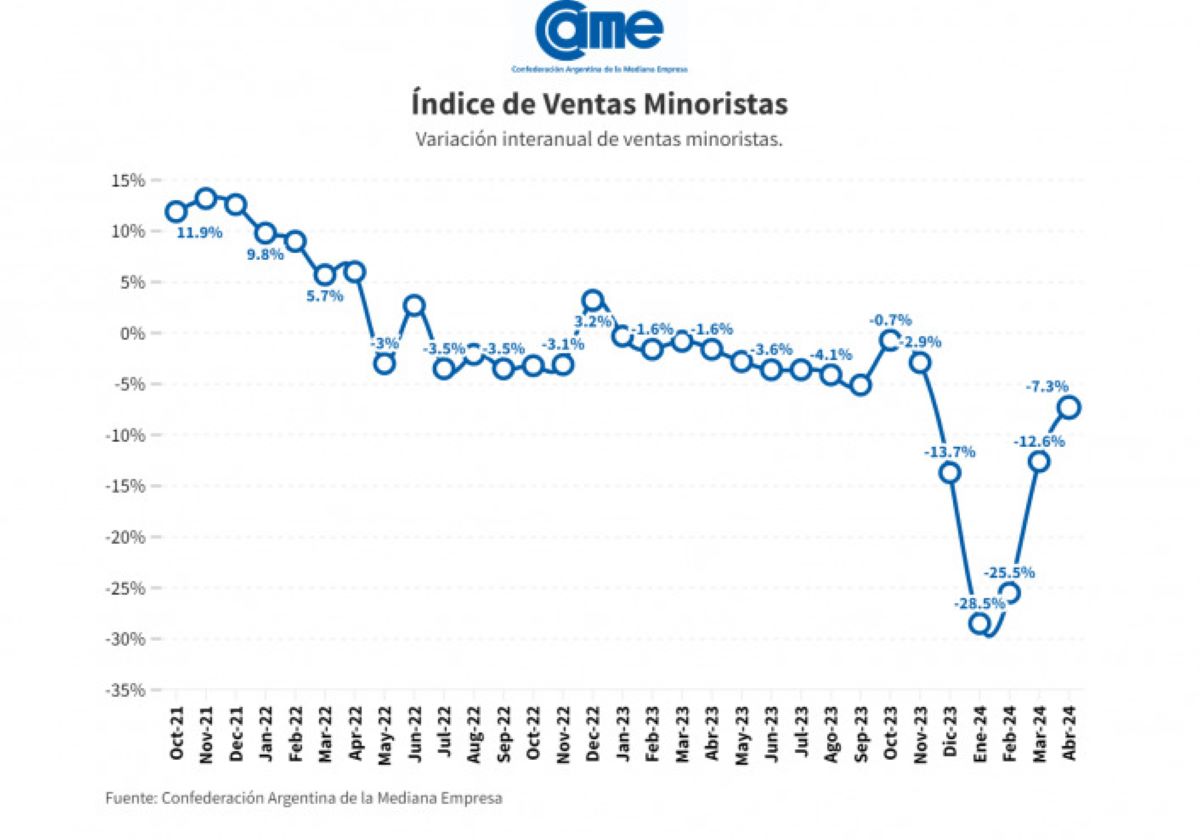 Los datos surgen del Índice de Ventas Minoristas Pymes de la Confederación Argentina de la Mediana Empresa (CAME), que elaboró un informe en base a un relevamiento mensual entre 1.276 comercios minoristas de todo el país realizado del 2 al 3 de mayo.
