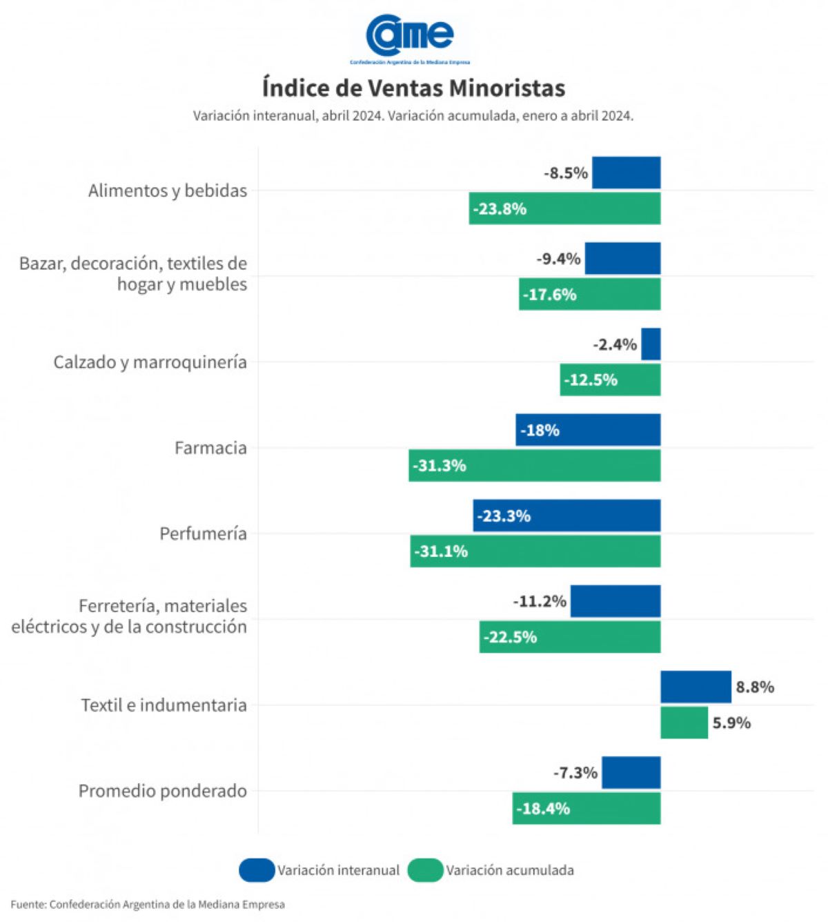 Además, destacó que seis de los siete rubros relevados mostraron caídas interanuales en el mes de abril.